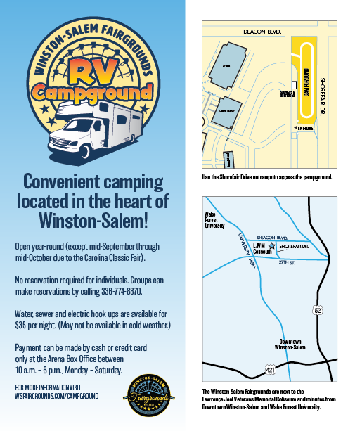 The RV Campground is available for use throughout the year with the exception of mid-September through mid-October due to the annual Carolina Classic Fair.