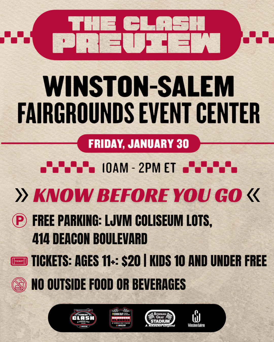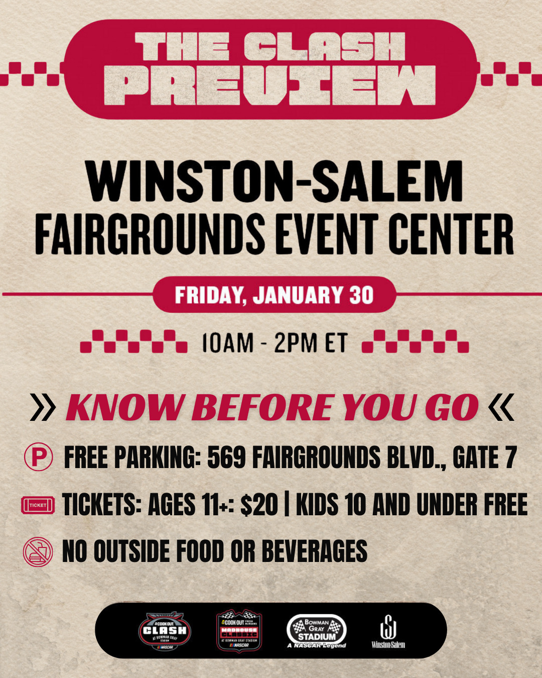 The Winston-Salem Fairgrounds is excited to host the NASCAR Clash tech inspections and Clash Preview in 2026! This special event will kick off a weekend of excitement and entertainment, bringing together fans, drivers, and the city of Winston-Salem.
